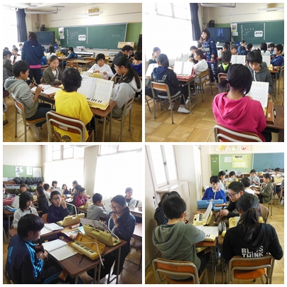 2組は音楽の授業です。班ごとに「雨のうた」という曲を、リコーダーと鍵盤ハーモニカを使って、合奏の練習をしていました。