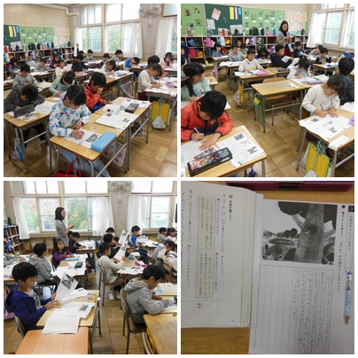 2年1組は国語の授業です。「お話のさくしゃになろう」という単元の学習で、それぞれ自分の考えた物語を作っていました。