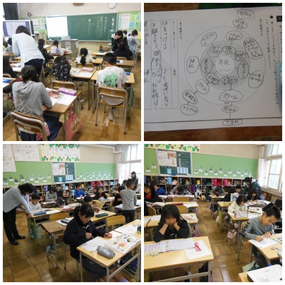 2組は国語の授業です。「食べ物のひみつを教えます」という単元の学習で、調べたい材料を選び、本で調べたことを図や表に表していました。