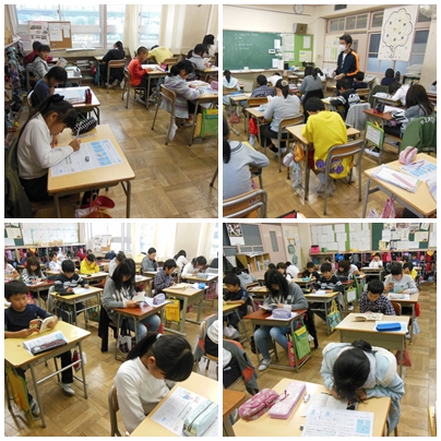 4年1組は理科の授業です。「物の体積と温度」に関する単元テストに取り組んでいました。