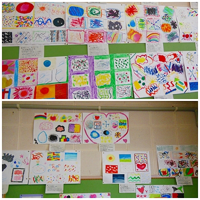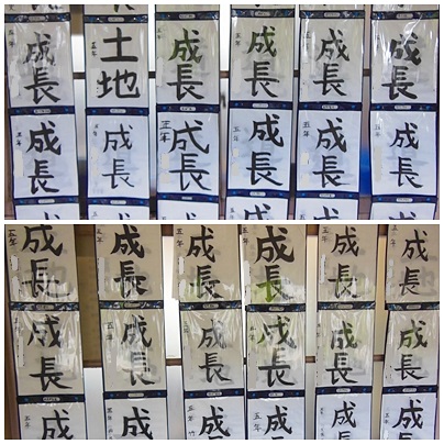 5年生の掲示物です。毛筆で書いた「成長」という文字が廊下には掲示してあります。