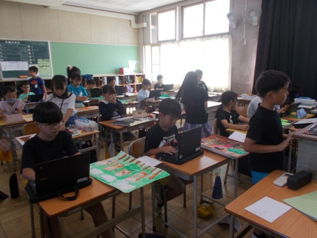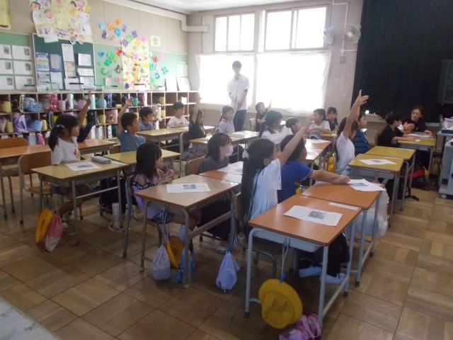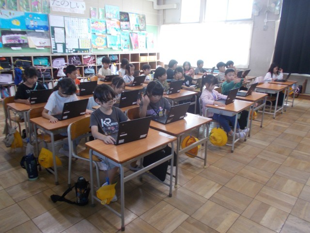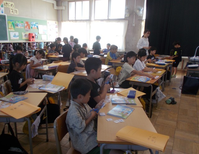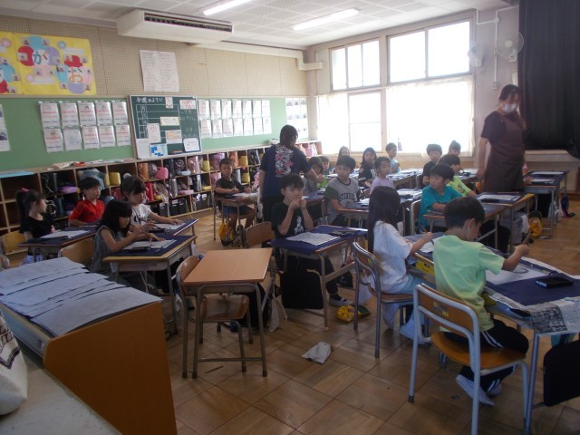 今日は書の先生が来てくださいました。1,2年生が筆を使って水習字に挑戦です。みんなとても楽しそうに筆の感覚を確かめていました。