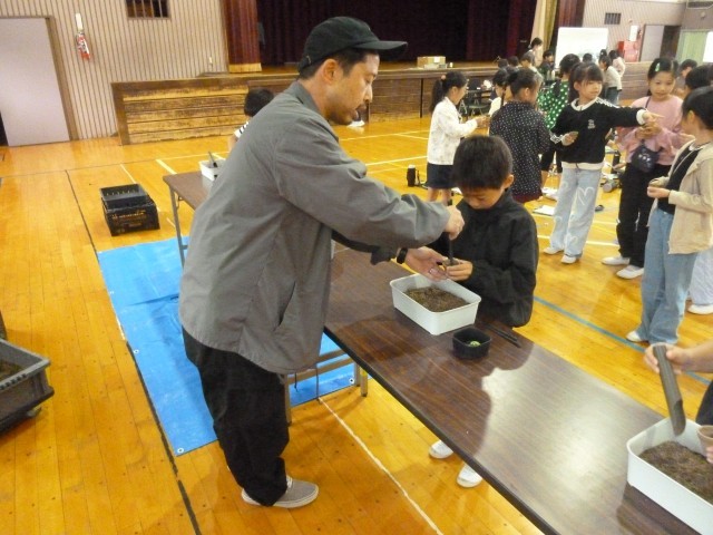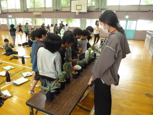 本日は、出前授業で「後藤サボテンさん」に来ていただきました。多くの種類のサボテンについて、クイズなどを交えながら分かりやすく教えていただき、子どもたちは夢中になって学んでいました。実際に自分の手でサボテンを植える活動では、命あるものを大切にしようと優しい気持ちで植えている様子がうかがえました。後藤サボテンさんには、貴重な体験をさせていただき、心より感謝申し上げます。