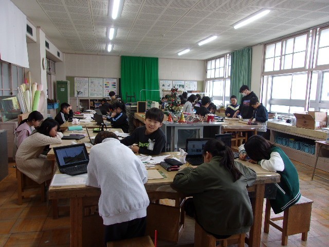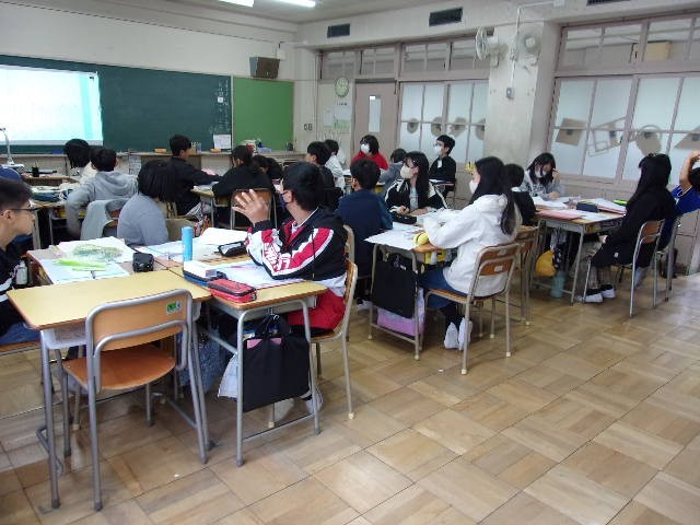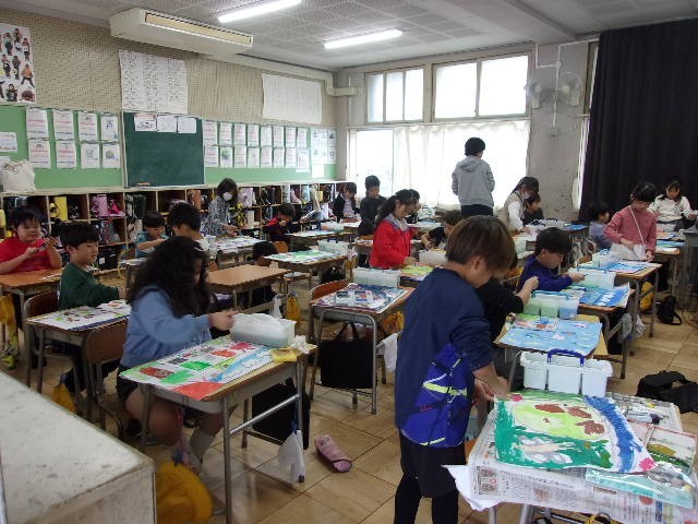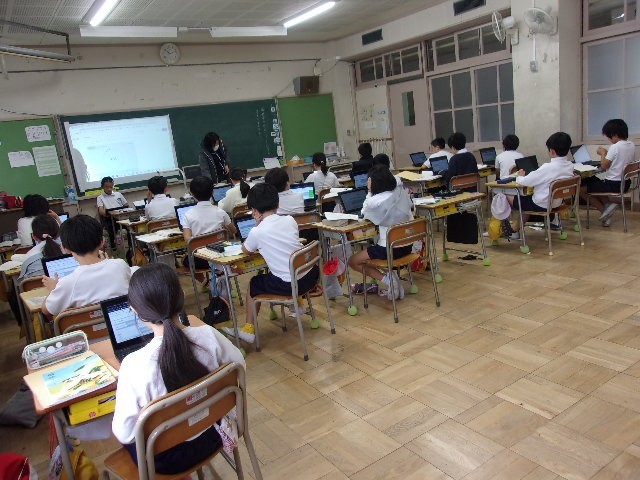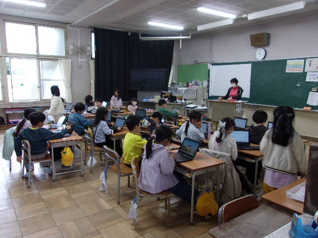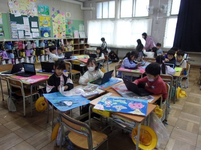 図画工作の授業では、絵を描いている学級が多くありました。みんな思い思いに筆を動かして楽しそうに描いていました。授業ではクロムブックを活用してお互いの意見を共有していました。