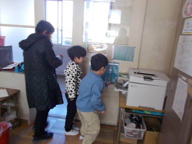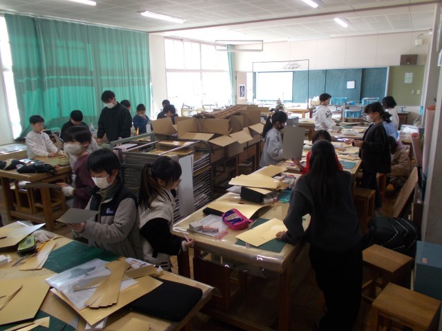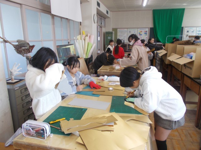 1年生は国語の学習で必要な資料をコピー機で印刷していました。5年生の図工では金色の厚紙を使ってスタンドライトを制作しています。出来上がりが楽しみです。