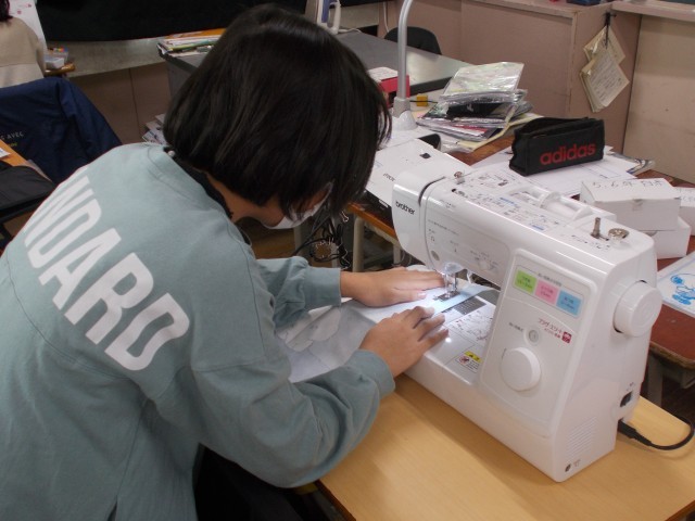 5年生の家庭科ではミシンを使ってエプロンづくりに挑戦しています。初めてのミシンなので、糸がからまったり、線がずれてしまったりしながらも、エプロンの形になっていく過程に笑顔があふれていました。