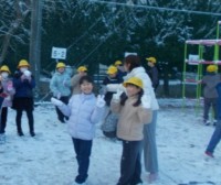 登校後、ランドセルを教室で片付けた子どもたちが、雪の残っているところへ急いで駆...