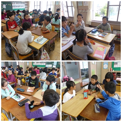 秋の花のプランターに、クラスで決めた人権標語の木札を添えます。