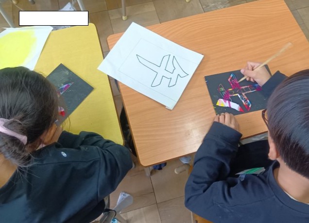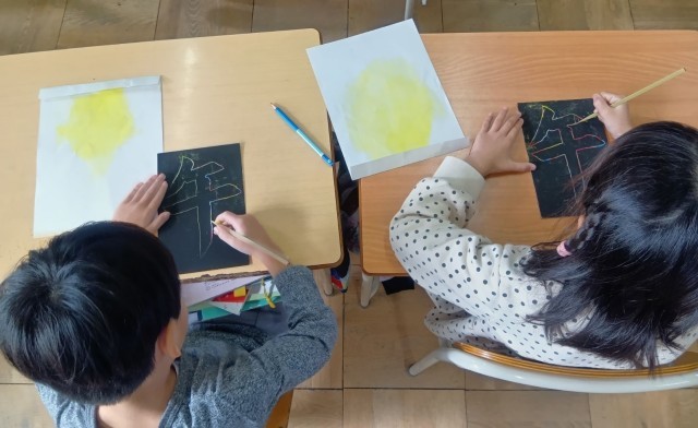 レインボーペーパーをけずり棒で削り、来年の干支である「午」をかたどり、内側に模様をつけました。