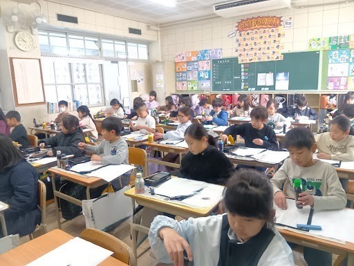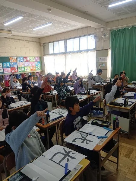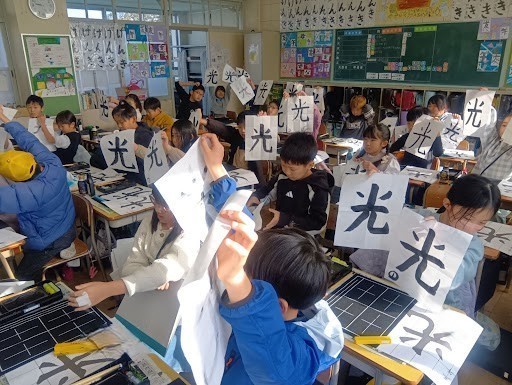 本日、書の時間がありました。 挑戦した文字は「光」です。「光」は「はらい」「はね」「曲がり」と習字の基本となる大切な要素がある漢字です。子どもたちは講師の先生に筆先の向きや力の入れ具合をていねいに教わりました。最初は「曲がり」や「はね」に苦戦していた子どもたちでしたが、先生のアドバイスを意識して、何度も書いているうちにどんどん滑らかで力強い線に変わっていきました。清書を書き終えた後、授業の最初に書いた字と見比べてみると、どの子も上手に書けるようになっていて、自分自身の成長を実感することができました。授業参観の際にぜひご覧ください。