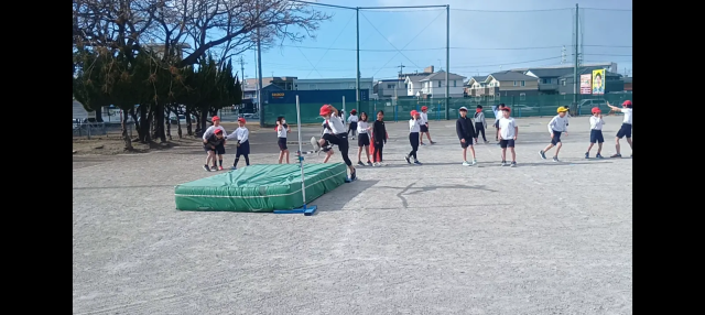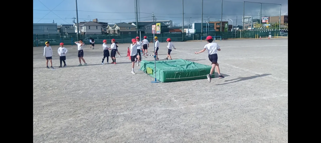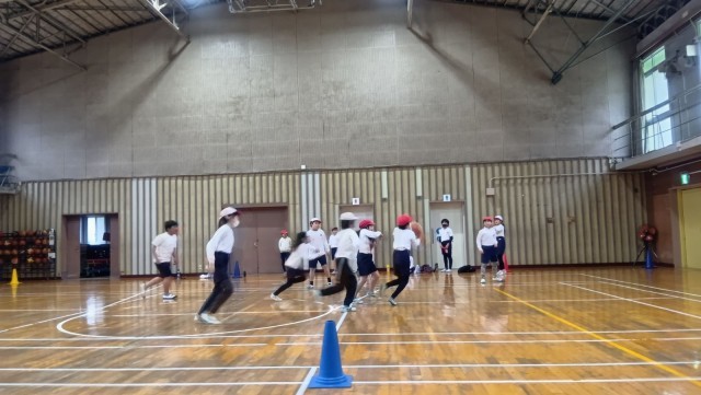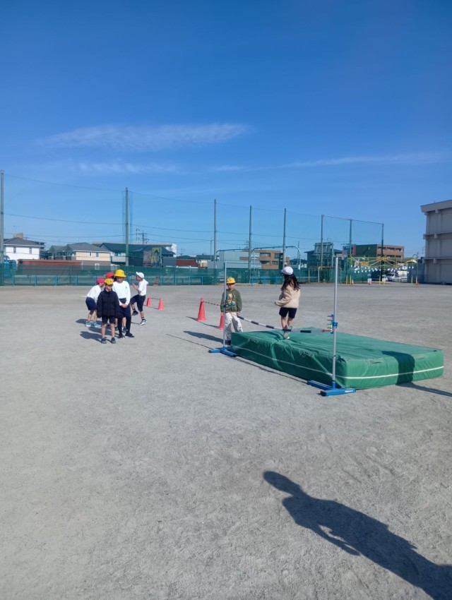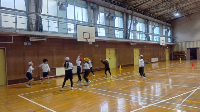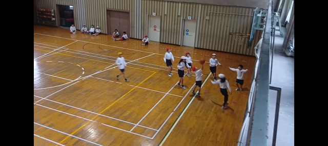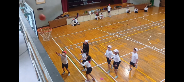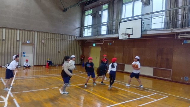 体育の授業で、高跳びとバスケットボールに取り組みました。高跳びでは、自分の目標記録を超えられるように、助走や踏み切りを工夫して何度も跳ぶ姿が見られました。バスケットボールでは、シュートやパス練習をした後、試合をしています。ゴールに向かってドリブルをしたり、仲間にパスをつないだりして、声をかけ合いながらチームで協力することができました。