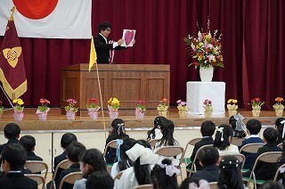 本日、無事に119名の新入生を迎えることができました。校長先生から子どもたちへ、三つのキーワード「にこにこ」「わくわく」「もりもり」が紹介され、各クラスに、「心のスイッチ」がプレゼントされました。その後、6年生代表が歓迎のことばを述べました。