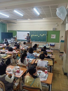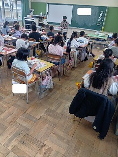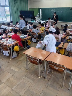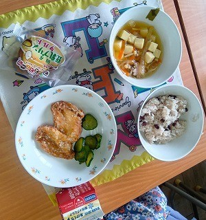 2年生以上の児童には、今日から給食が始まりました。初日の献立は、「せきはん、ぎゅうにゅう、さくらのすまし汁、鶏肉のから揚げ、キュウリのおかかあえ、こめこプリンタルト」でした。おいしそうに食べる子どもたちの姿がたくさん見られました。1年生も来週が待ち遠しいですね。