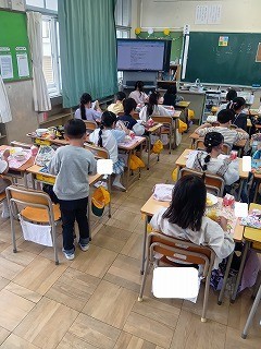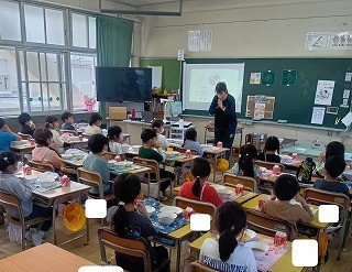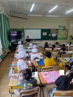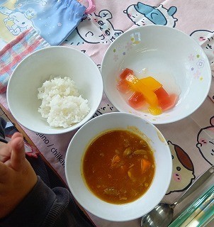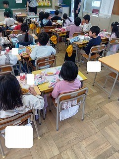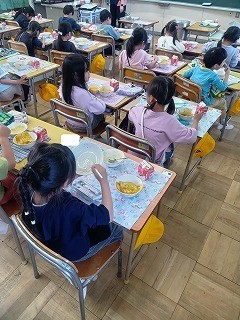 21日(火)に1年生が小学校初の給食を食べました。担任から、給食当番の仕事や、配膳、食事のマナー、片付けなどのやり方を学びました。これから身につけられるといいですね。献立は、ご飯、牛乳、えがおのカレーシチュー、あまなつみかんのゼリーあえでした。おいしかった―の声もたくさん聞かれました。今日もおいしかったね!