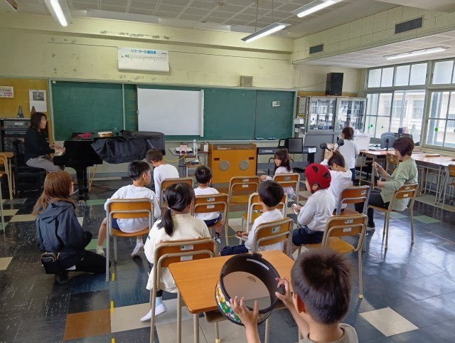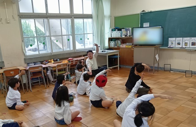 体育の授業でストレッチをやっています!クイズもあってみんなで楽しみました!音楽の授業では「おもちゃのチャチャチャ」に合わせて楽器を演奏しました。