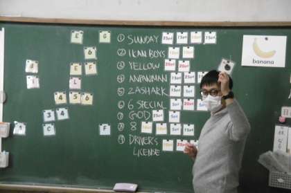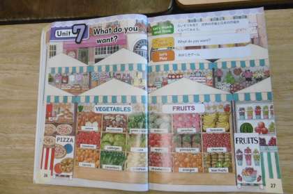 ALTのマイケル先生と一緒に4年生は学んでいます。マイケル先生が野菜や果物のカードを少しづつ見せていきます。正解の果物や野菜を英語で答えるとポイントが入ります。班別でゲームをしながら楽しく学んでいましたね。