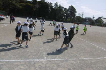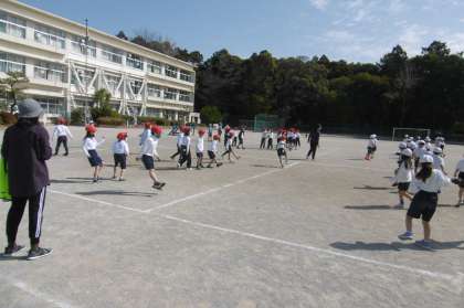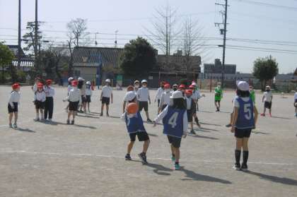 1年生は体育の授業でドッチボールをしています。ちょうど2組さんと4組さんが隣同士のコートでゲームをしていました。