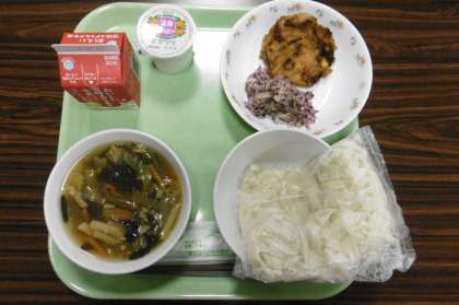今日の献立はきしめん、牛乳、ごもくきしめん、愛知県産野菜のかきあげ、キャベツのゆかり和え、あいちのみかんゼリーです。