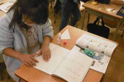 実際に折り紙で作った三角形を2つに切って確かめていましたね。