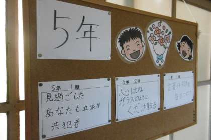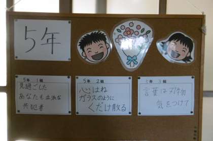 北館1階の児童会室前の掲示板に5年生の人権標語が掲示されていました。