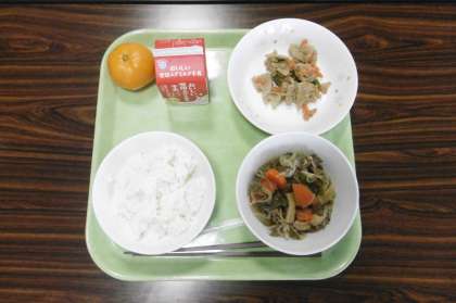 12月20日(火)今日の給食の献立は、ごはん、牛乳、牛丼の具、レンコンとツナのきんぴら、みかんです。