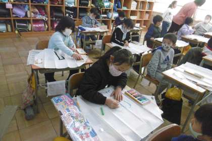 凧が完成たら、この後広い運動場で凧あげをする予定です。