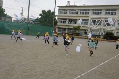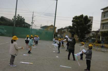 お友達と協力して凧あげができました。走る人と凧をもってタイミングよく離してあげる人と役割分担しましたね