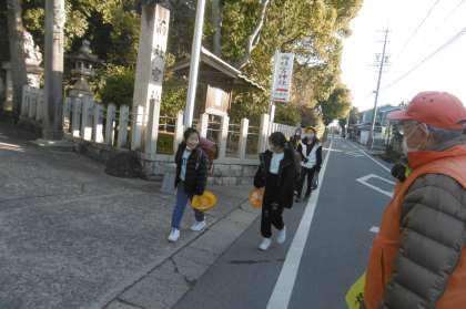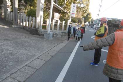 オレンジベストの子ども応援団のみなさんの見守りの中、元気に登校しています。