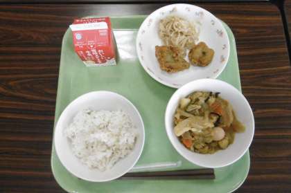 1月17日(火)今日の給食の献立は、麦ごはん、牛乳、八宝菜、あじのフリッター(2個)、もやしのナムルです。
