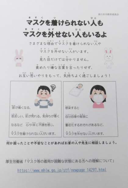 様々な理由でマスクを着けられない方やマスクを外せない方が見えます。学校内においても不安なく過ごせるように配慮をしていきたいと思います。