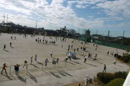 運動場には大勢の子ども達がなかよく遊んでいます。
