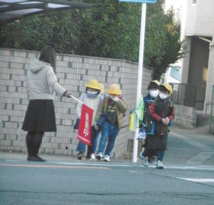 横断歩道にはPTAの旗当番のみなさんが、登校を見守ってくださいました。