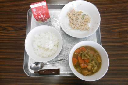 1月19日(木)今日の給食の献立は、ごはん、牛乳、厚揚げカレーどんの具、きりぼしだいこんサラダ、ココア牛乳のもとです。