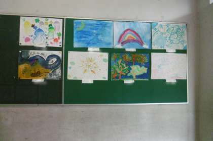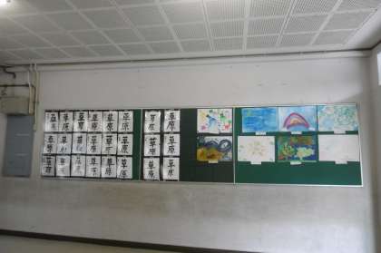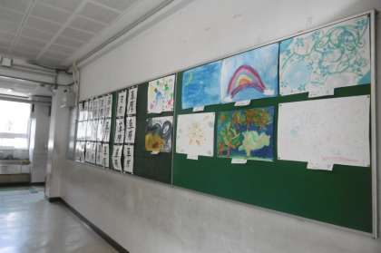 本館と北館をつなぐ「いこいの広場」の作品が新しくなりました。3年生の絵と5年生の書の作品が掲示されています。ぜひ近くを通るときは作品に注目してください。