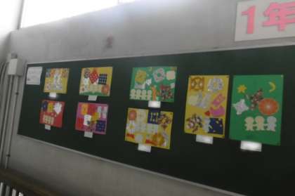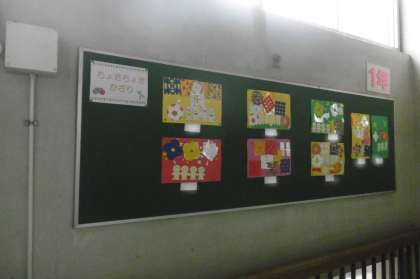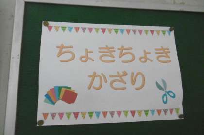 「ちょきちょきかざり」の作品が掲示されています。はさみを上手に使って、楽しい作品をつくることができました。