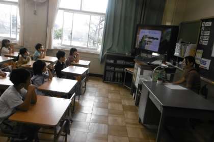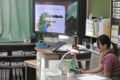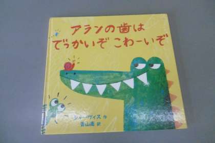 あじざい読書週間の一こまです。1年生の教室では先生が読み聞かせをしていました。読んでもらっていたのは「アランの歯はでっかいぞ こわーいぞ」です。ちょうど見に行ったときは前日からの続きだったようで、みんなとてもお話しを楽しみにしていました。本となかよしになっていますね。