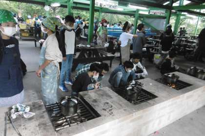 引き続き、野外炊事の様子です。どの仕事も一生けん命できましたね。おいしいカレーライスはみんなの協力のお陰ですね。おいしいごはんでエネルギーチャージができました。次はキャンプファイヤーです。