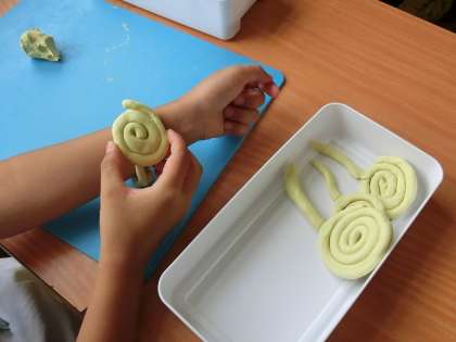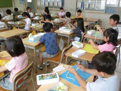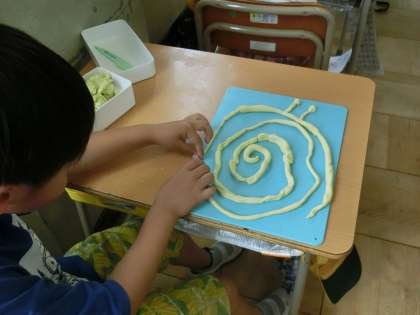 1年生の図工です。粘土を細く伸ばした形を生かし、自由に発想したものを作りました。写真の作品はカタツムリと腕時計です。他には巻いてペロペロキャンディーを作った子もいました。それぞれのアイデアが生かされていて、面白い作品ができあがりました。