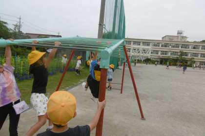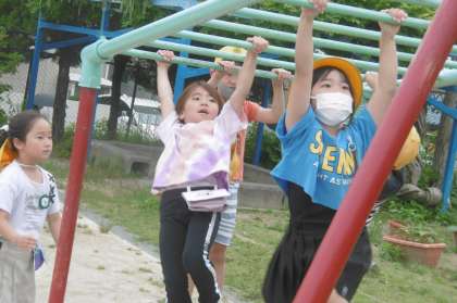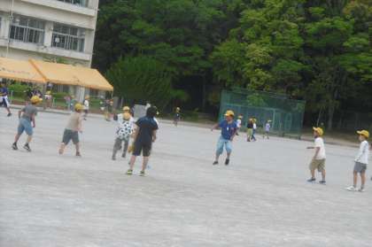 曇り空ですが、朝から元気いっぱいに外で遊んでいます。雲を吹きとばすように元気な春小の子どもたちです。