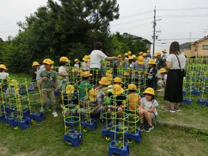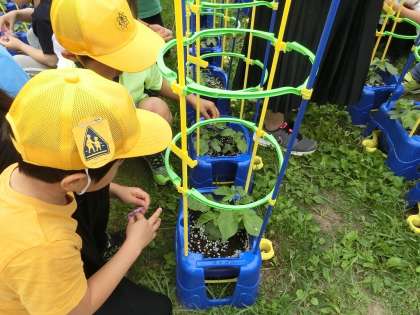 1年生の生活科です。2クラス同時に朝顔の観察をしました。もっと大きく育つように肥料をまいたり、観察しやすいように周囲の草を抜いたりもしました。朝顔は前回の観察時よりも大きくなっており、子どもたちも生長ぶりに驚いていました。