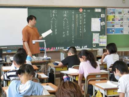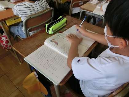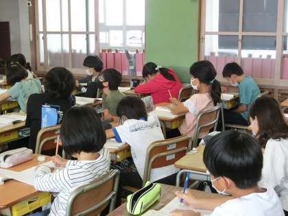 5年生の国語です。漢字の音・訓の学習です。具体的な例文に語句を当てはめ、どちらがふさわしいかを考えました。声に出して読んでみると、ちょっと面白い内容になってしまうものもあり、みんなで楽しみながら学習できました。