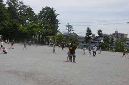 放課の時間に春小の子どもたちは、教育実習生と一緒に遊んでいます。