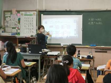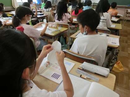 4年生の算数です。垂直と平行を理解するため紙を折りながら、線と線の関係を確認しました。また、1組の三角定規を組み合わせて、垂直な線と平行な線をかく練習も行いました。