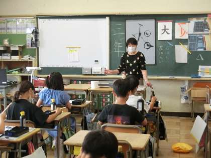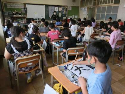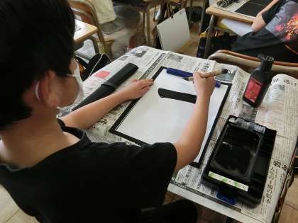 3年生の書写です。今日は講師の先生に教えていただきながら「大」を書きました。写真のように筆の入りを45度にして、穂先が線の上側を通るように意識しながら書くことができる児童が大勢いました。筆遣いの基本となりますので、忘れずに練習していきましょう。