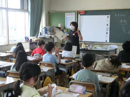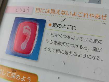 3年生の保健です。健康とばい菌について学んでいました。手を洗わずに給食を食べるとどうなるのか、また、足の裏にはどれくらいばい菌が潜んでいるのかを、資料を見ながら学習しました。写真を見た子どもたちからは「え〜、ばい菌こんなにいるの!?」と驚きの声が上がっていました。