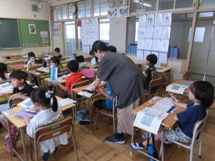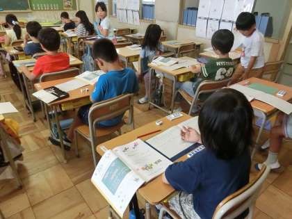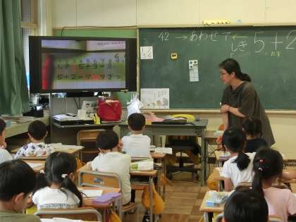 1年生の算数です。数図ブロックを使いながら足し算の問題を考えました。ノートに式と答えを書いていましたが、どの児童もよく理解できていました。少しずつでいいので、数図ブロックの操作が頭の中でできるようになってくるといいですね。