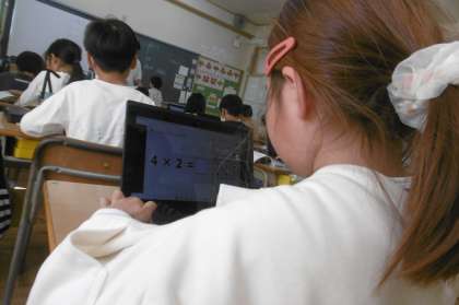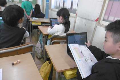 2年生の算数の授業の様子です。九九の学習を進めています。九九を覚えたところをタブレットを使って粘り強く練習しています。だんだん問題を解くスピードも上がり、張り切って学習しています。