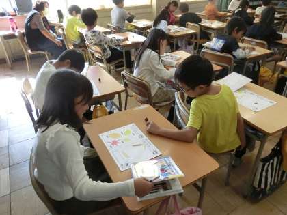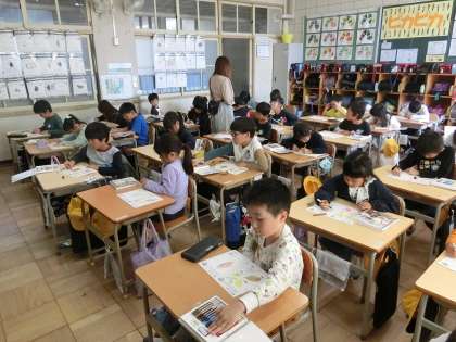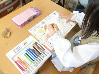 1年生の生活科です。落ち葉の色を観察し、どんな色を使って塗っていくとよいかを考えました。一見同じ色だけに見えるけれど、よく観察すると濃い部分や薄い部分、違う色になっている部分などいろいろな発見をしていました。