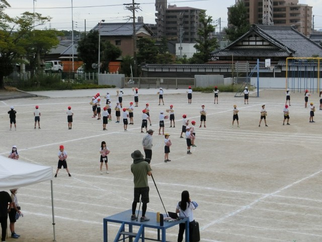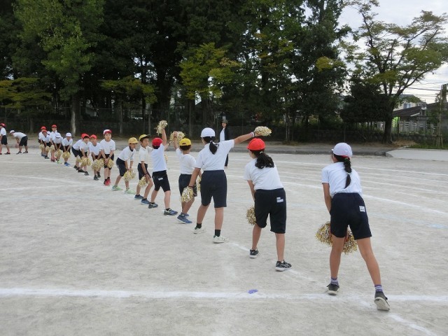4年生の練習風景です。初めてクラスカラーのポンポンを持って踊りました。見せ場のウェーブもきれいにそろうようになりました。