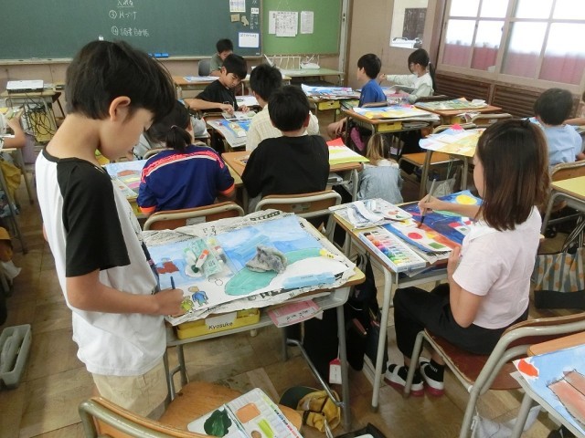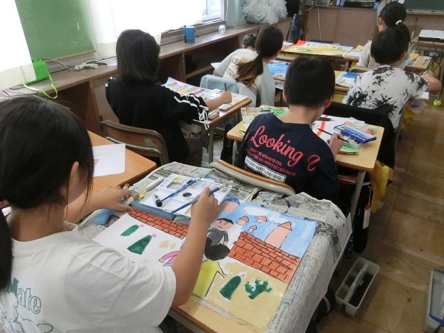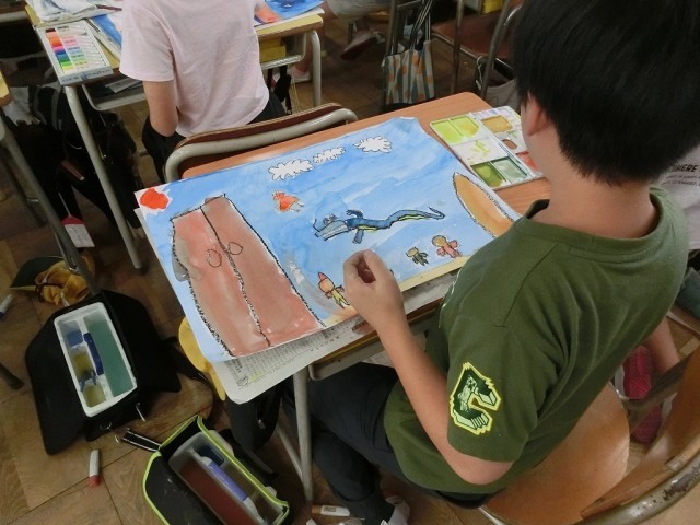 4年生の図工です。読書感想がの続きです。自分が想像する龍を描き入れながら、お話の一場面を完成させます。